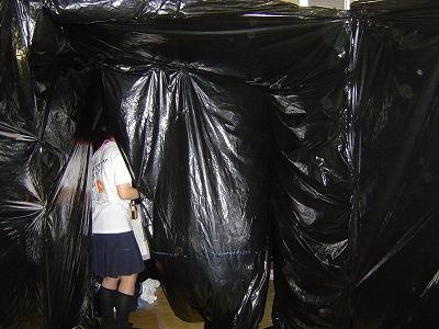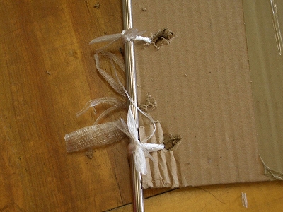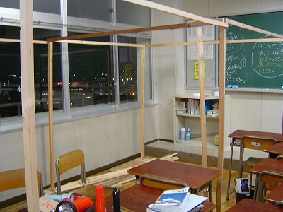 プラスチックのポールと段ボール箱で柱をつくり、ポールをジョイントさせてと梁を作り上げていました。