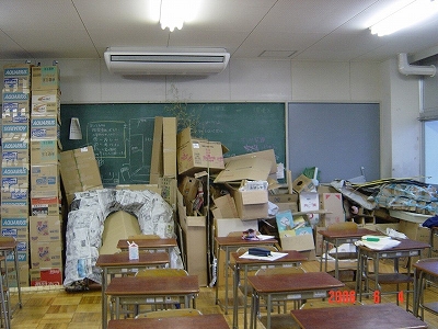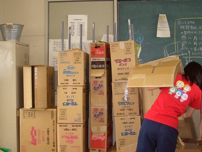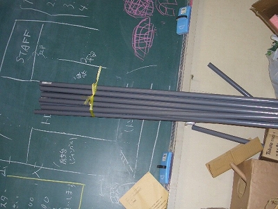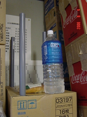 プラスチックのポールと段ボール箱で柱をつくり、ポールをジョイントさせてと梁を作り上げていました。